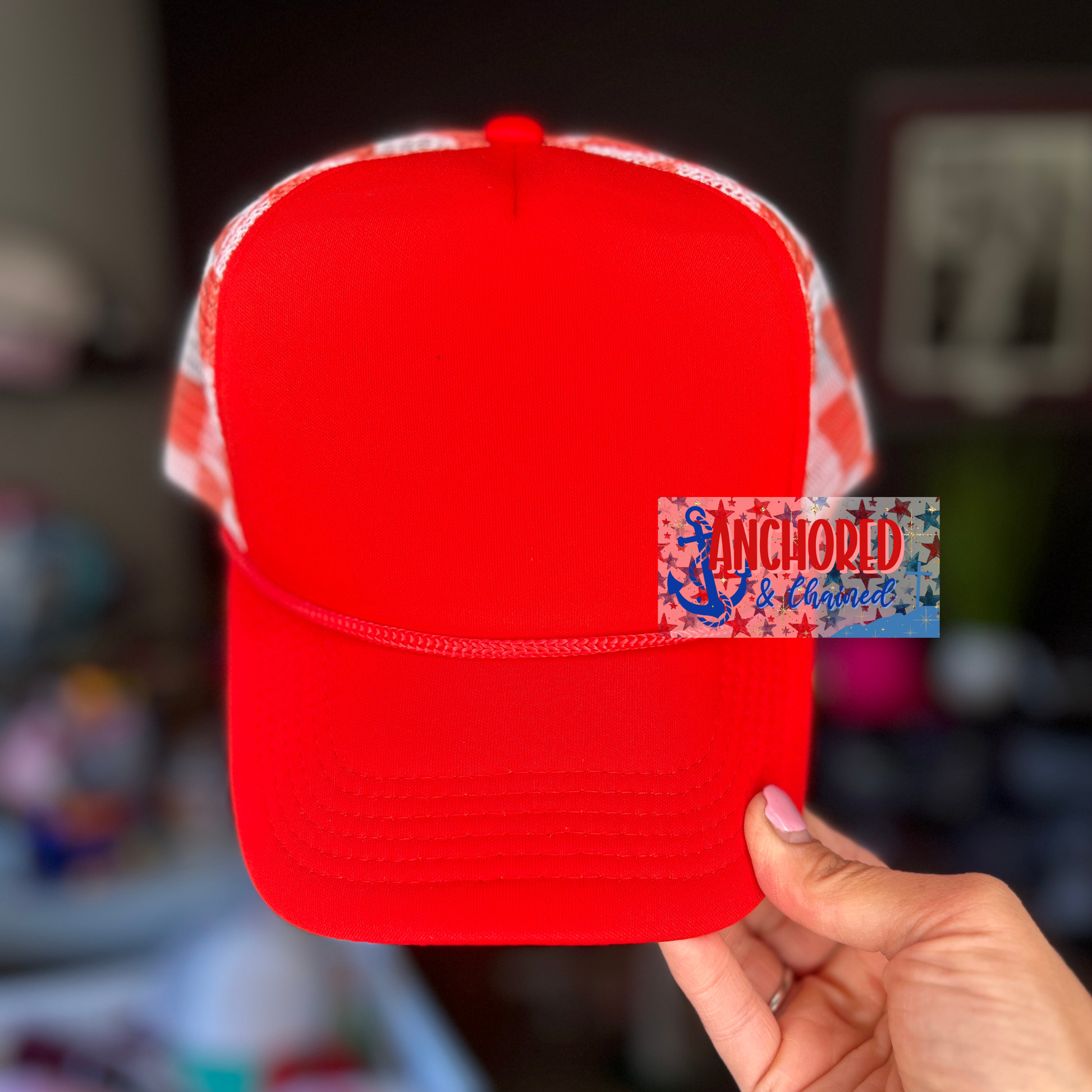 Bring the party to any day with this bold red and white checkered trucker hat — classic for Christmas, game day, or wherever you want to show your team spirit.